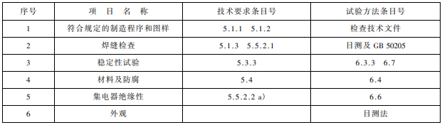 6 1 焊縫檢驗采用目測法 6 2 環(huán)境適應性檢測 6 2 1 溫度用 0 ~ 100 ℃溫度計測定。 6 2 2 pH 值測定按 GB / T 6920 進行。 6 3 性能試驗 6 3 1 運行速度用秒表和鋼尺測量、計算求得。 6 3 2 可靠性、耐久性試驗 空載試驗不少于 8 h;負荷試驗不少于 72 h。正常運行平均無故障工作時間和使用壽命根據(jù)用戶 調查確定。 6 3 3 穩(wěn)定性試驗 出廠檢驗時其傳動部分在制造廠內組裝后進行,型式檢驗應在負荷試驗或正常運行時進行。 a)用鉗形表測量工作電流; b)各部位溫升應在開機 2 h 后用溫度計測量。 c)噪聲測量按 GB / T 3768 進行。 6 4 涂裝質量檢驗 a)漆膜厚度使用電磁式漆膜測厚儀測量; b)外觀用目測法檢驗; c)漆膜附著力按 GB / T 1720 的規(guī)定進行檢驗; d)如表面進行熱噴涂應按 GB / T 9793 進行檢測。 6 5 主梁的撓度測量,應在安裝以后進行,用鋼絲和直尺測得。 6 6 絕緣電阻采用兆歐表測量。 6 7 過力矩保護裝置的可靠性用力矩試驗機測量。 6 8 集電器耐壓試驗,在 2 000 V 試驗電壓的條件下做耐壓試驗 1 min,無擊穿現(xiàn)象。 6 9 中心回轉支承中滾道和鋼球硬度根據(jù) JB / T 2300 的檢測方法,用硬度計測量。